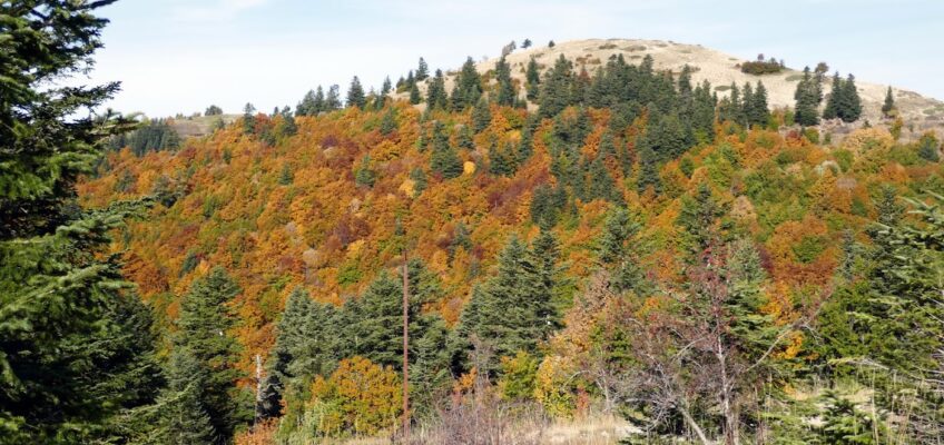 Phare de l’arrière-pays provençal, la montagne de Lure chère à Jean Giono, petite sœur du mont Ventoux, culmine à 1826 mètres. Nous ne dépasserons pas les 1700 m et allons nous diriger vers le coté ouest en partant de la station, la randonnée commence en forêt teintée de couleur allant du jaune, orange et caramel, l’automne s’installe doucement, la température est douce pour la saison. La hétraie traversée par un chemin légèrement en contrebas descendant jusqu’au bois des glacières nous plonge dans le décor. Nous remontons sur la droite et débouchons sur une lande où la lavande essaye de se frayer un chemin au milieu des genévriers rampants, nous atteignons le replat des Roux, nous poursuivons sur la crête, la vue panoramique sur la Provence, les Préalpes de Digne et la vallée du Jabron est grandiose, nos yeux ne sont pas assez grands pour tout voir. On voudrait presque rester là et ne plus bouger, ne pas cesser de regarder encore et encore, c’est trop beau, les qualificatifs ne sont pas assez puissants pour décrire le spectacle. Nous sommes aux Barres, nous suivons cette crête jusqu’à la crête des Cavalets montée sympathique pour les mollets. Suivie d’une super descente pour les genoux, suivie de montée et descente tout en admirant le sublime paysage qui s’offre à nos yeux. De vraies montagnes russes. Petite escapade pour certain par une belle montée pour découvrir le sommet de l’homme. La redescente vue par ceux qui sont restés au bas est assez artistique. C’est l’heure de prendre notre repas agréablement installé dans un endroit en amphithéâtre avec vue sur la vallée du Jabron, qui dit mieux. Un peu de repos et nous voilà reparti dans les montées et descentes du matin toujours sur les crêtes avant de déboucher sur la croupe du Pré du Fau. Nous gagnons un gros cairn marquant le Pré du Fau une vue panoramique à 360° sur les Alpes, le Mont Ventoux et la Provence une dernière fois. Nous descendons ensuite légèrement sur la gauche au milieu d’un éboulis de grosses pierres plates, nous atteignons la forêt puis une piste carrossable. Rejoignons une combe, puis de descentes en montées nous débouchons sur un chemin pris à l’aller qui nous ramèneras à notre point de départ. Ouf les rotules ont du bien se tenir.