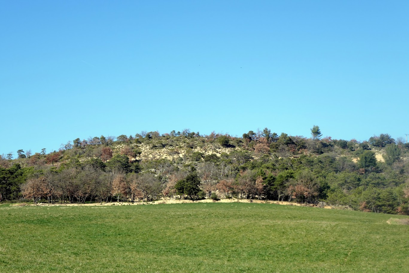 Nous partons 10 de l’ancienne route de Villeneuve sur un tracé qui n est pas un chemin mais qui y ressemble beaucoup pour descendre et rejoindre une piste qui nous amène vers des lacs collinaires de toutes beautés pour notre région. Un magnifique ciel bleu nous accompagne regardez le bien cela devient rare. Plusieurs torrents, dits « ravins », s’écoulent entre les collines et alimentent ces étendues d’eau. Les ravins de la Creuse (limitrophe de Saint-Maime), de l’Achanal, du Para, qui coulent du nord vers le sud et se jettent dans le Largue ; Le ravin de Saint-Saturnin, au nord de la commune se jette dans la Durance. Partons découvrir une partie de ces lacs il y en a au moins une dizaine, nous n’en verrons que quelques uns. Au début la végétation n’est pas très développée, nous marchons sur un sol très chargé de sable et de cailloux ou galets, la mer était présente. Au milieu de ces terrains tertiaires nous évoluons sur des Klippes sédimentaires glissées ou masses glissées durant l’oligocène. Nous retrouvons un beau chemin qui nous amène au 1er petit lac, après une petite montée nous avons la surprise de trouver un lac plus important, l eau reflète comme un miroir les arbres autour du lac, un vrai tableau. Nous longeons un moment ce réservoir d’eau pour retrouver une petite route qui nous amène vers un champs. Nous le longeons pour voir un 3ème lac celui-ci est un peu vert. Nous revenons sur nos pas pour traverser un joli bois, retour après la traversée d’un grand champs. Nous retrouvons nos masses glissées que nous regrimpons jusqu’à la route et retrouvons nos véhicules. Petits gâteaux et chocolats la randonnée est finie. Nous avons marché 4 kms 5 pour 170m. La marche fut courte mais magnifique. Bravo tout le monde vous avez grimpé comme des cabris. A bientôt pour d’autres aventures.