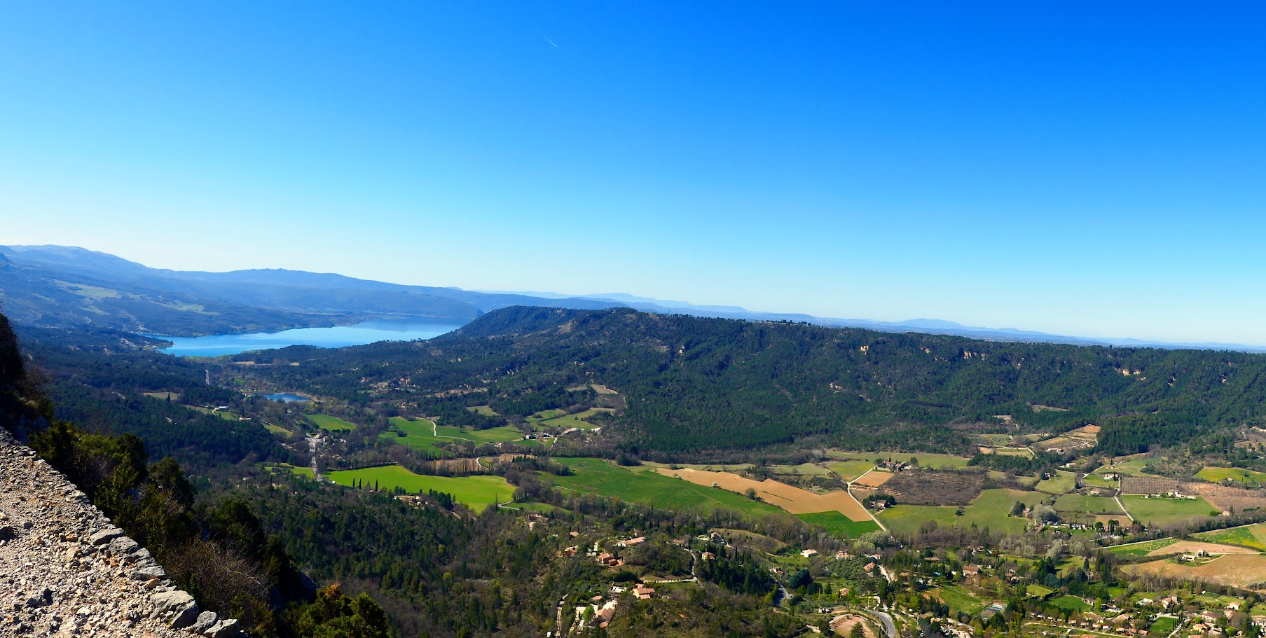 Nous allons démarrer par la route médiévale du Courchon (1 km et demi de caillasses jusqu’au sommet entre 200 et 300 m de dénivelé). Mais à la montée cela semble plus facile. Nous avons mis qu’une petite demi-heure. Dès lors nous dominons tout le pays avec le lac de Ste Croix. On se croirait presque au bord de la Méditerranée.