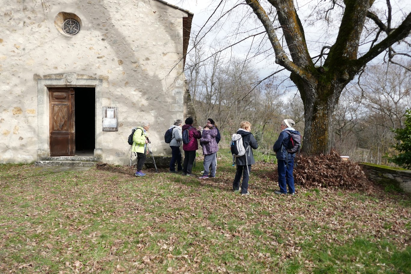 Après visite de cette superbe chapelle nous reprenons notre chemin en retraversant le Viou, toujours très actif. Nous remontons un très beau chemin en passant devant Le Haras de Bellavigne. Puis en contrebas du chemin c est l’ élevage d’Anes de Forcalquier. Ce chemin est magnifique traversant le bois de Pouvarel au milieu de chêne ancien, nous arrivons sur un chemin plat la vue est très dégagée, bien sur il a fallu que la pluie s’invite au voyage, par bonheur un cabanon sans porte nous engage à nous abriter. Puis nous retrouvons notre route du départ nous ramenant à nos véhicules. Encore un bel après-midi en comité très sympa clôturé par un superbe arc en ciel. Nous avons marché 5 kms 5 pour 140 m de dénivelé. Merci à vous tous et à bientôt sur de nouveaux chemins.